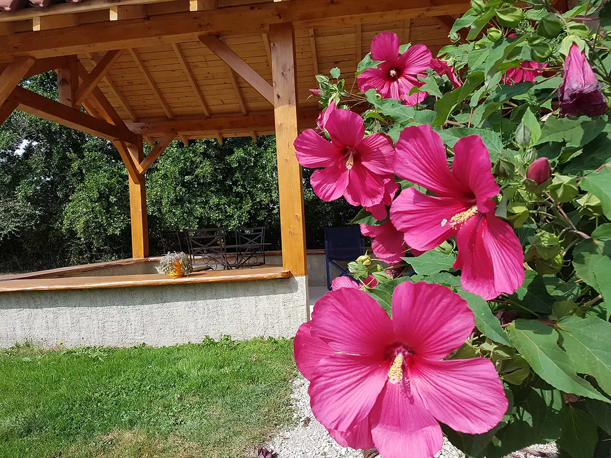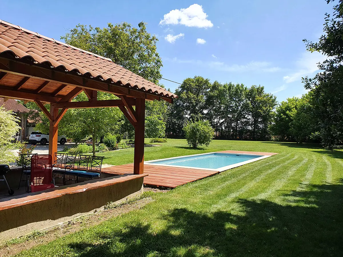 Extérieur : Terrasse, salon de jardin, espace verdoyant et piscine